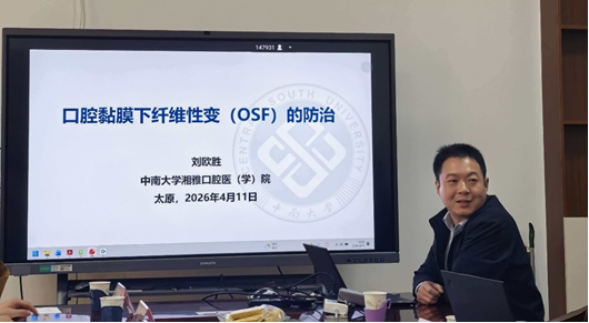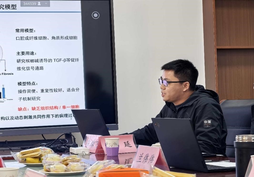 研讨会上,刘欧胜教授率先作“口腔粘膜下纤维性变(OSF)的防治”主题报告,系统介绍了团队依托院士工作站及省级科研平台,在槟榔相关口腔疾病领域取得的系列原创成果,重点阐述了OSF临床诊断、槟榔相关口腔癌、牙胚发育与替换机制、口腔生物材料四大核心研究方向的进展。研究明确,咀嚼槟榔产生的机械应力是OSF的首要致病诱因,其可直接损伤口腔黏膜并协同化学刺激加速黏膜纤维化进程。基于这一关键发现,团队提出改造槟榔硬度以降低机械刺激的产学研转化思路,为OSF疾病防治提供了科学可行的技术方案。