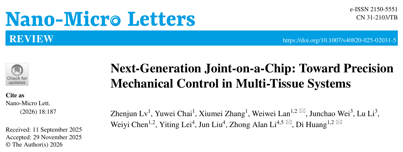 近日,我校人工智能学院黄棣教授团队与香港中文大学李中教授团队在国际顶级期刊《Nano-Micro Letters》(SCI一区,IF 36.3)发表了题为“Next-Generation Joint-on-a-Chip: Toward Precision Mechanical Control in Multi-Tissue Systems”的最新成果。该论文的第一署名单位为太原理工大学,人工智能学院硕士研究生吕振军为第一作者,我校黄棣教授、兰伟伟副教授和香港中文大学李中教授为共同通讯作者。
