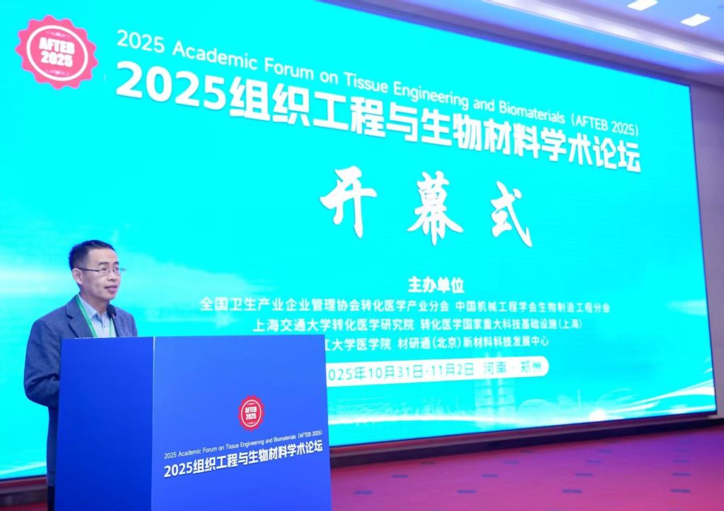 2025年10月31日-11月2日,由全国卫生产业企业管理协会转化医学产业分会、中国机械工程学会生物制造工程分会、上海交通大学转化医学研究院、浙江大学医学院、材研通(北京)新材料科技发展中心等共同主办的“2025组织工程与生物材料学术论坛(AFTEB2025)”在河南郑州成功举行。