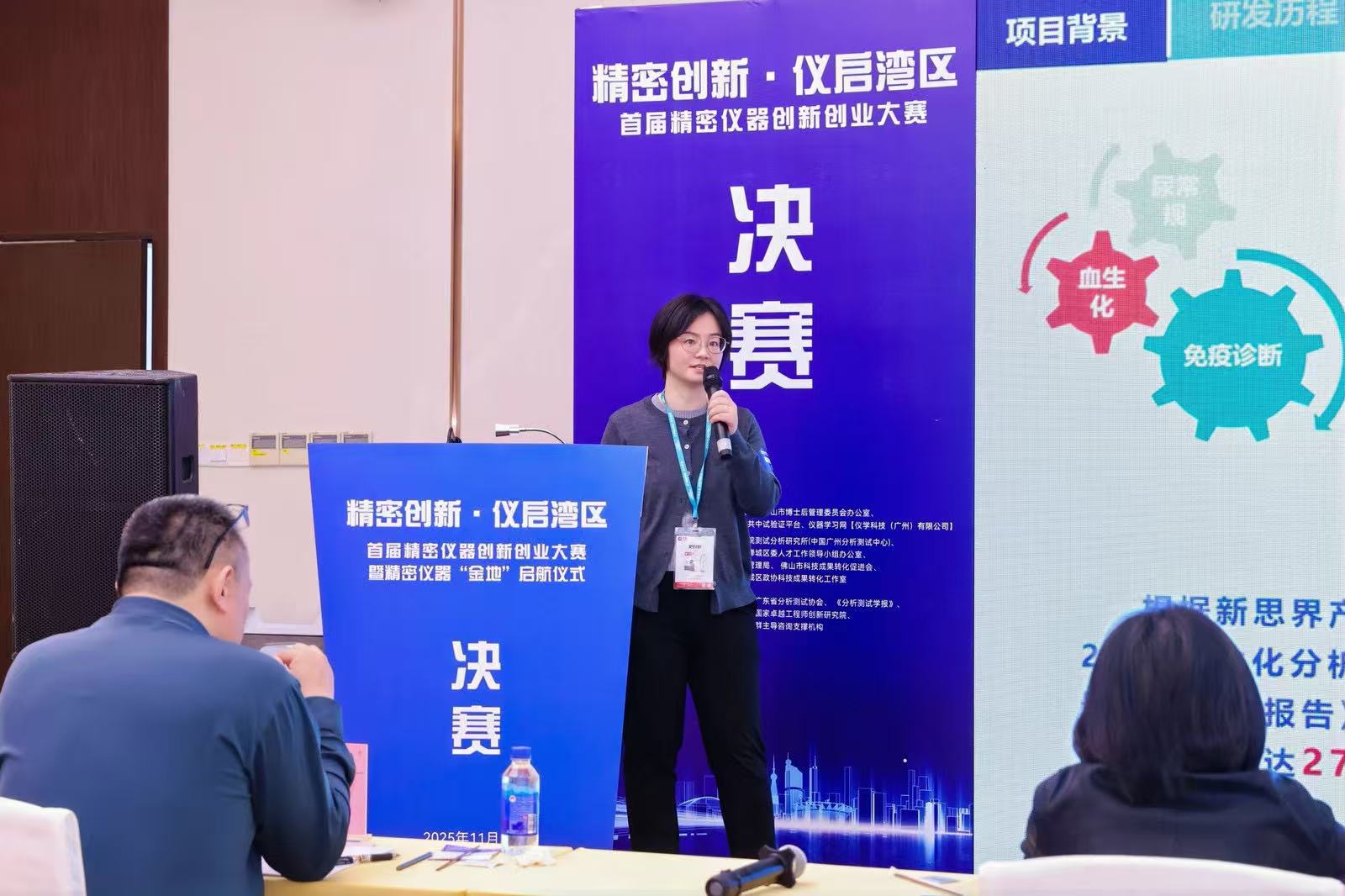 2025年11月15日,由广东省科学院与佛山市人才局指导,广东省科学院佛山产业技术研究院联合广东省精密仪器先进制造技术公共中试验证平台、仪器学习网共同主办的“精密创新·仪启湾区”首届精密仪器创新创业大赛,在广州保利世贸博览馆圆满落幕。大赛以“精密创新·仪启湾区”为主题,吸引了来自科学仪器、智能装备、检测设备等领域的包括高校科研院所、创新创业团队及行业企业近百家创新主体参赛。经过初筛、复赛和决赛三轮严格评审,最终29个优质项目晋级复赛,17个项目入围决赛(其中初创组12项、成长组7项)。人工智能学院生物医学精准检测与仪器研究所李晓春教授团队的“芯光一代”生化分析仪项目脱颖而出,荣获初创组优胜奖,团队成员张玲玲博士作为代表参加比赛,进行路演。