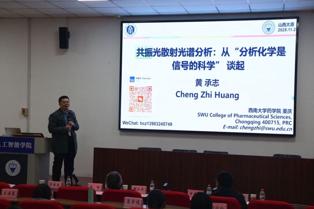 西南大学黄承志教授则以“共振光散射光谱分析:从‘分析化学是信号的科学’谈起”为题,带来了一场层层递进的学术分享。他从“分析化学是信号的科学”这一核心观点切入,系统阐释了共振光散射的基本原理与技术特征,随后梳理了该技术从理论提出到实际应用的完整发展脉络。在此基础上,黄教授结合多个跨领域案例,介绍了共振光散射光谱分析技术在生物检测、材料分析等领域的创新应用。其深入浅出的讲解方式将复杂的学术知识通俗化,有效激发了在场师生的思考热情。